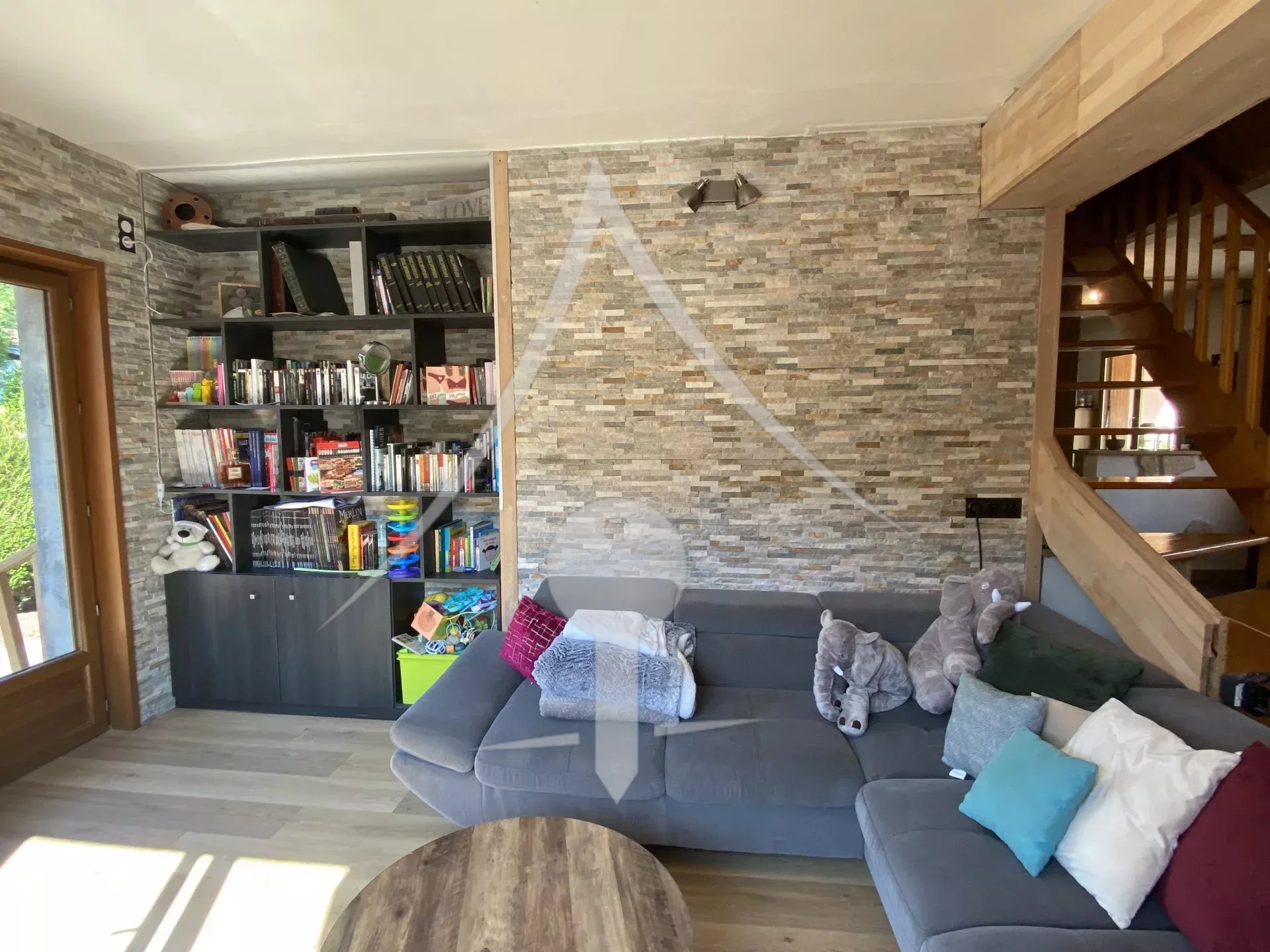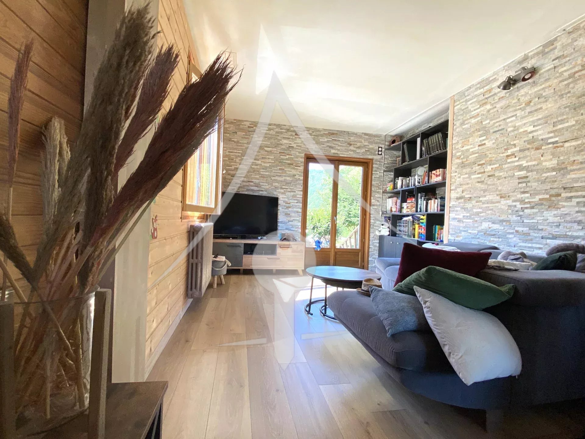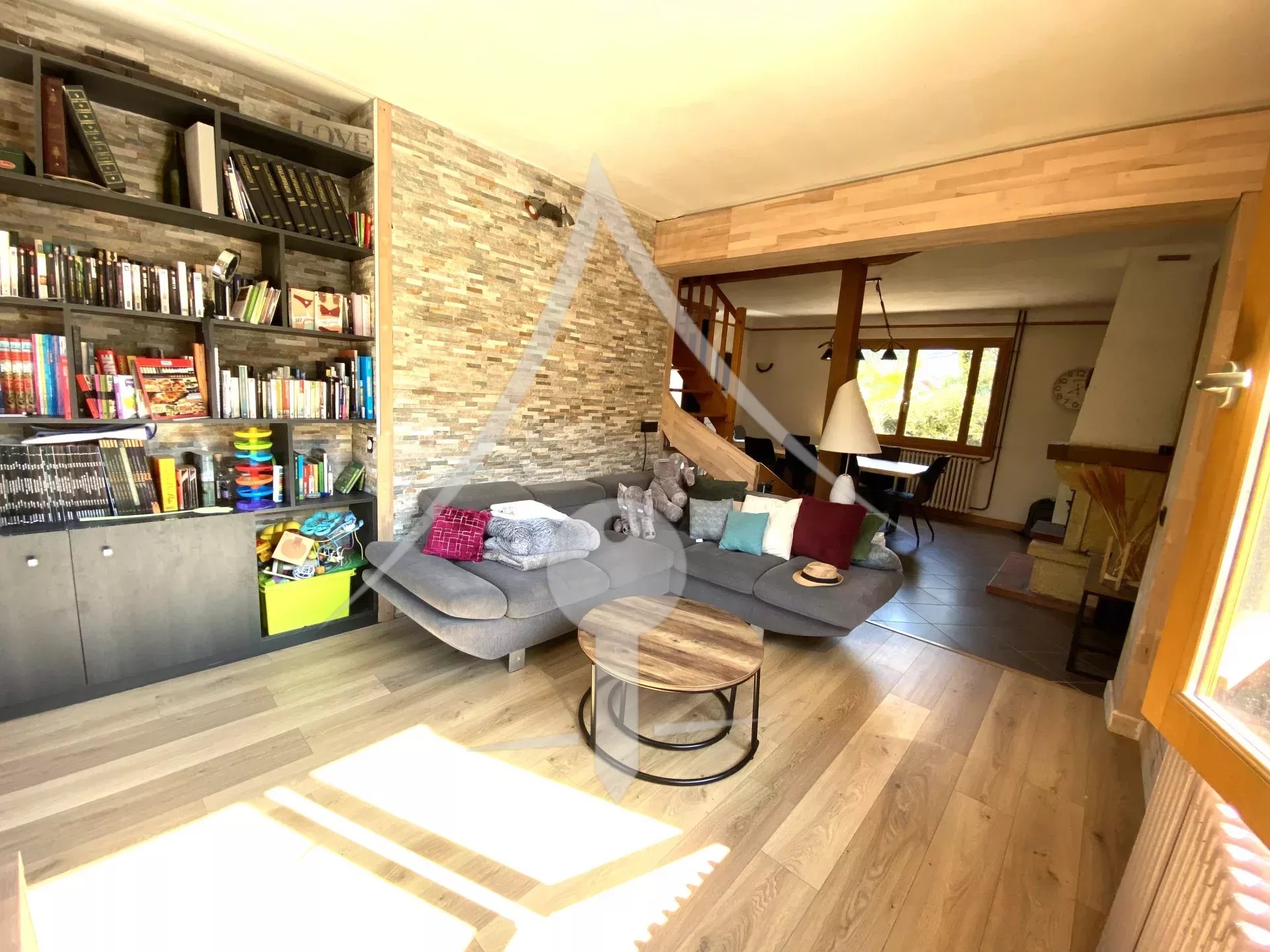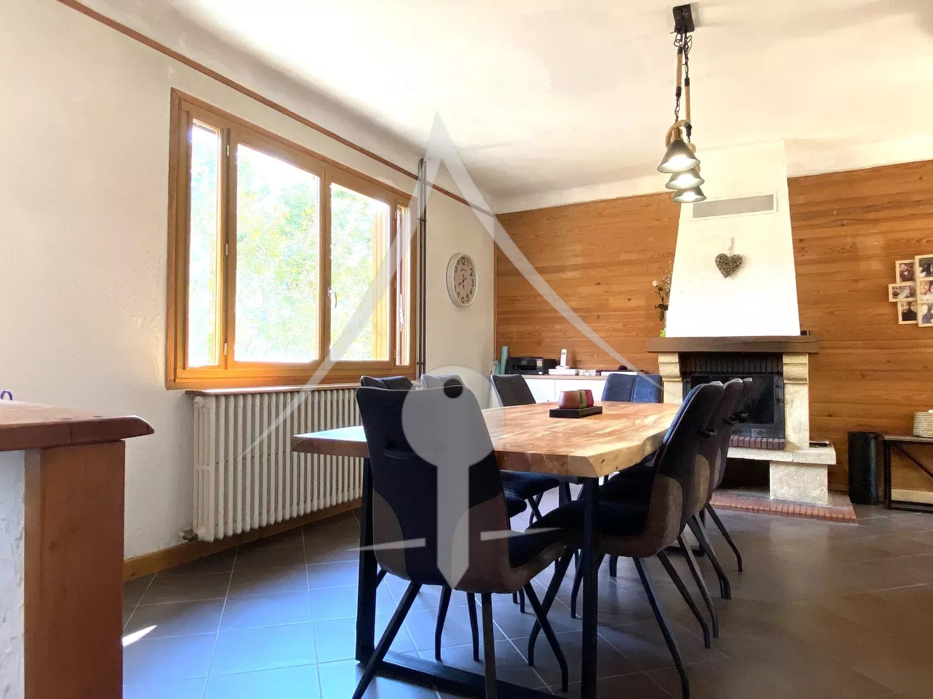 Voici sa composition: Entrée sur une grande pièce de vie cosy, compartimentée en 3 parties : Cuisine équipée et aménagée, salle à manger avec cheminée ainsi qu'un salon intime avec coin bibliothèque.